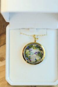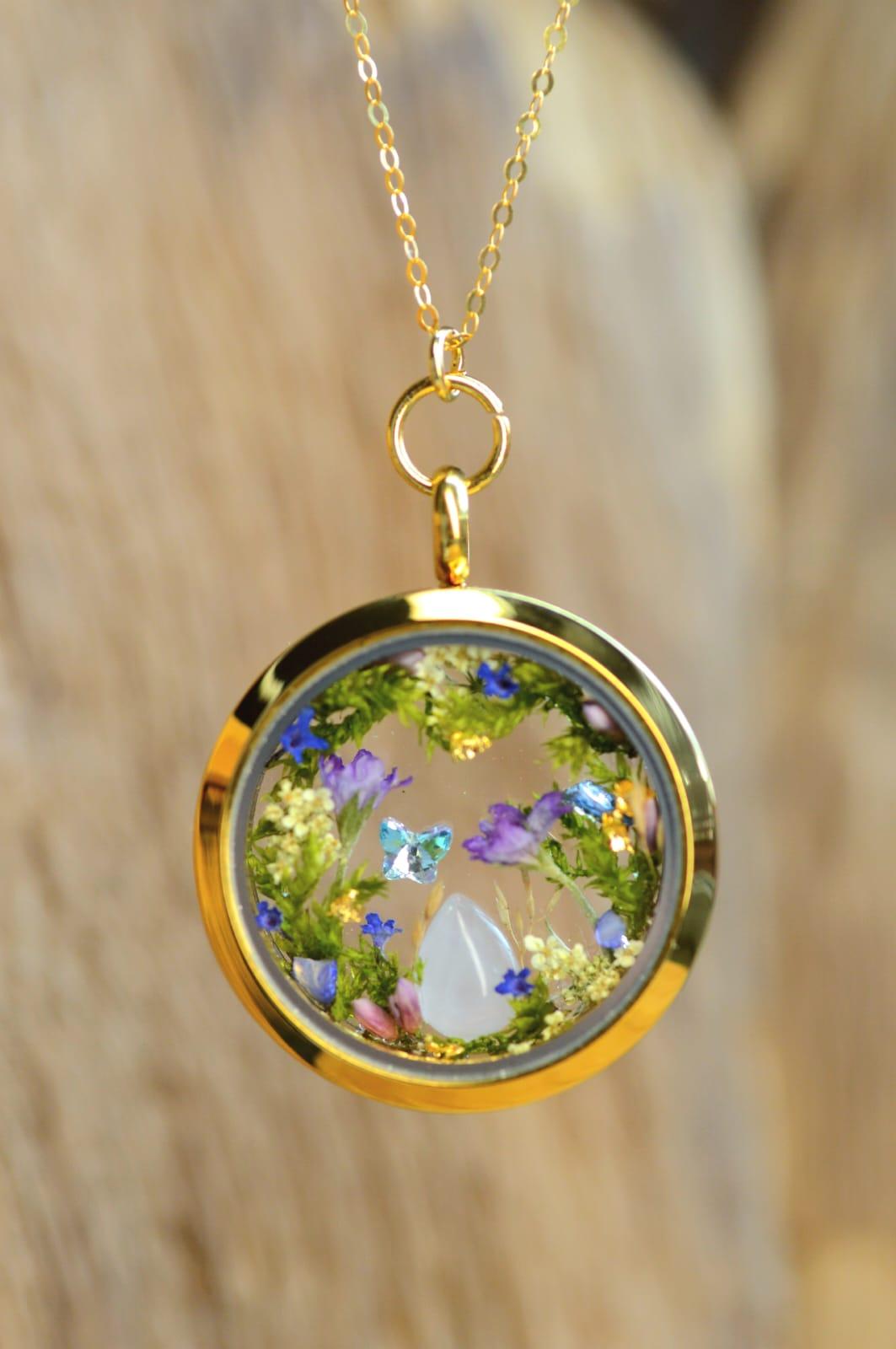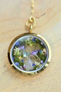 rveine) herbes,mousses forestières séchées, un cristal holographique de couleur bleu, une pierre fine quartz blanc, éclats de coquillages, feuilles d’or.